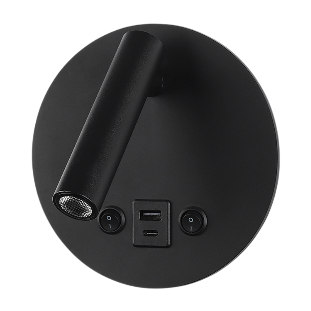 Round Wall Reading Light with Backlighting, USB & USB-C Port, Matt Black, 2W+6W LED
